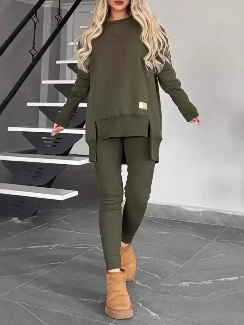 - Estilo: Conjunto de dos piezas (sudadera y pantalón) con diseño contemporáneo y corte relajado, ideal para los meses de otoño.