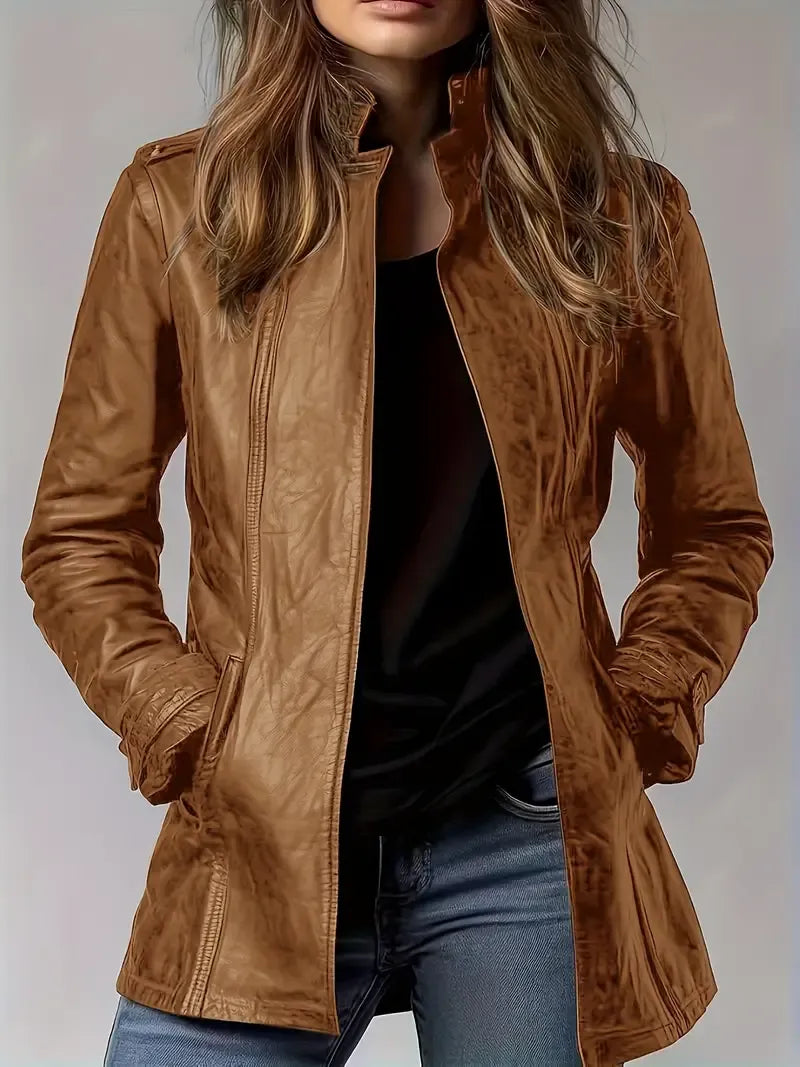 - Estilo: Chaqueta motera femenina con cremallera frontal y cuello elevado 3D – ideal para un look moderno y urbano.