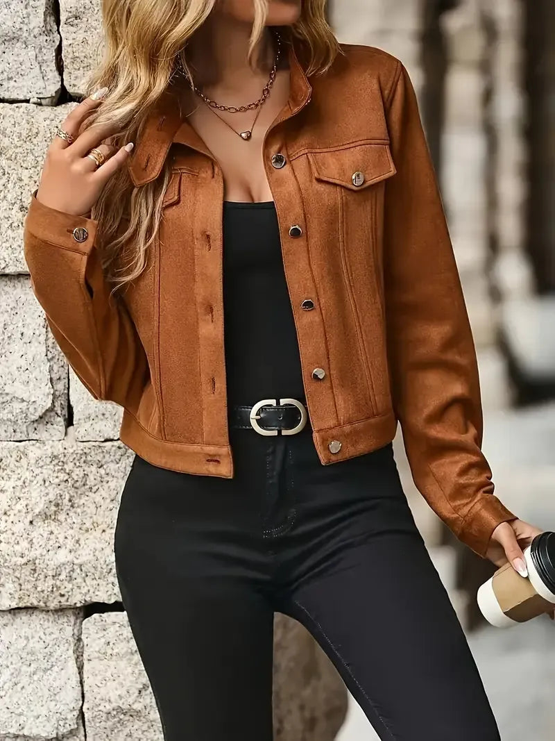 • Encanto vintage: Su diseño con cuello de pie y botones frontales evoca el espíritu clásico de las chaquetas retro, aportando un toque sofisticado y femenino a cualquier conjunto.
